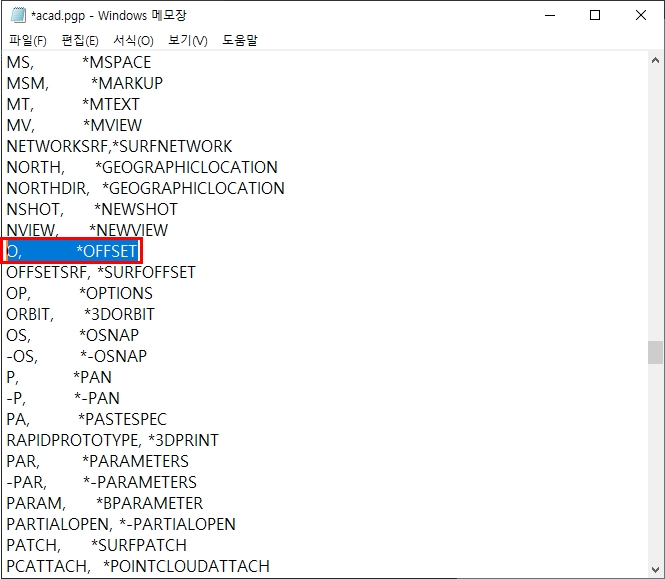 · 저는 OFFSET 단축키를 바꿔 보겠습니다. 바꿀 명령어 줄을 복사 합니다. (지우지 마세요)