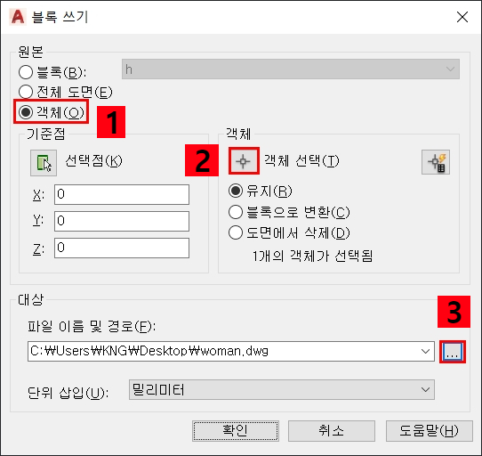 WBLOCK은 선택한 객체나 블록을 도면 파일로 저장
